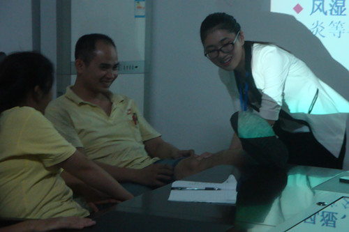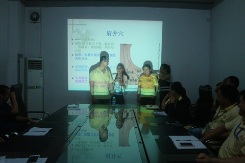 陳老師還現(xiàn)場向員工們傳授了穴位保健相關基礎知識和有效的預防及改善方法。通過真人模擬的方式,用電療儀等輔助治療器械幫助員工了解疏通穴位、測量血壓的操作方法。