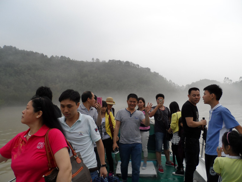 剛到丹霞山附近,就下起了瓢潑大雨,好像是老天有意要讓我們這些遠道而來的游客先歇歇腳。沒辦法,只好在用過午餐后到預先訂好的旅館內休息。約莫過了1小時,雨終于停住了,團隊終于可以出發了。我們步行來到景區門口,照張集體照顯然是很有必要的。在導游的帶領下,團隊一行漫步來到了第二站:丹霞山的標志性景區陽元山。一路游客并不多,主要聚集在拍攝區拍攝陽元石,然后原路返回。第三站:水上丹霞乘坐游船游錦江。人們常說“桂林山水甲天下,陽朔山水甲桂林”,我認為錦江山水完全可以與漓江相媲美。我們登上游船,在船長的講解下,充分發揮大家的想象力,一路可以看到睡美人、群象出山,六指琴魔、拇指山、龜頭山、啤酒瓶山等自然景觀,每一景點無不形神相似。江兩岸的綠樹、紅巖、霧海、寺廟以及河流構成了如夢如幻的人間仙境,真有種“舟行碧波上,人在畫中游”的感覺,充滿了詩情畫意。